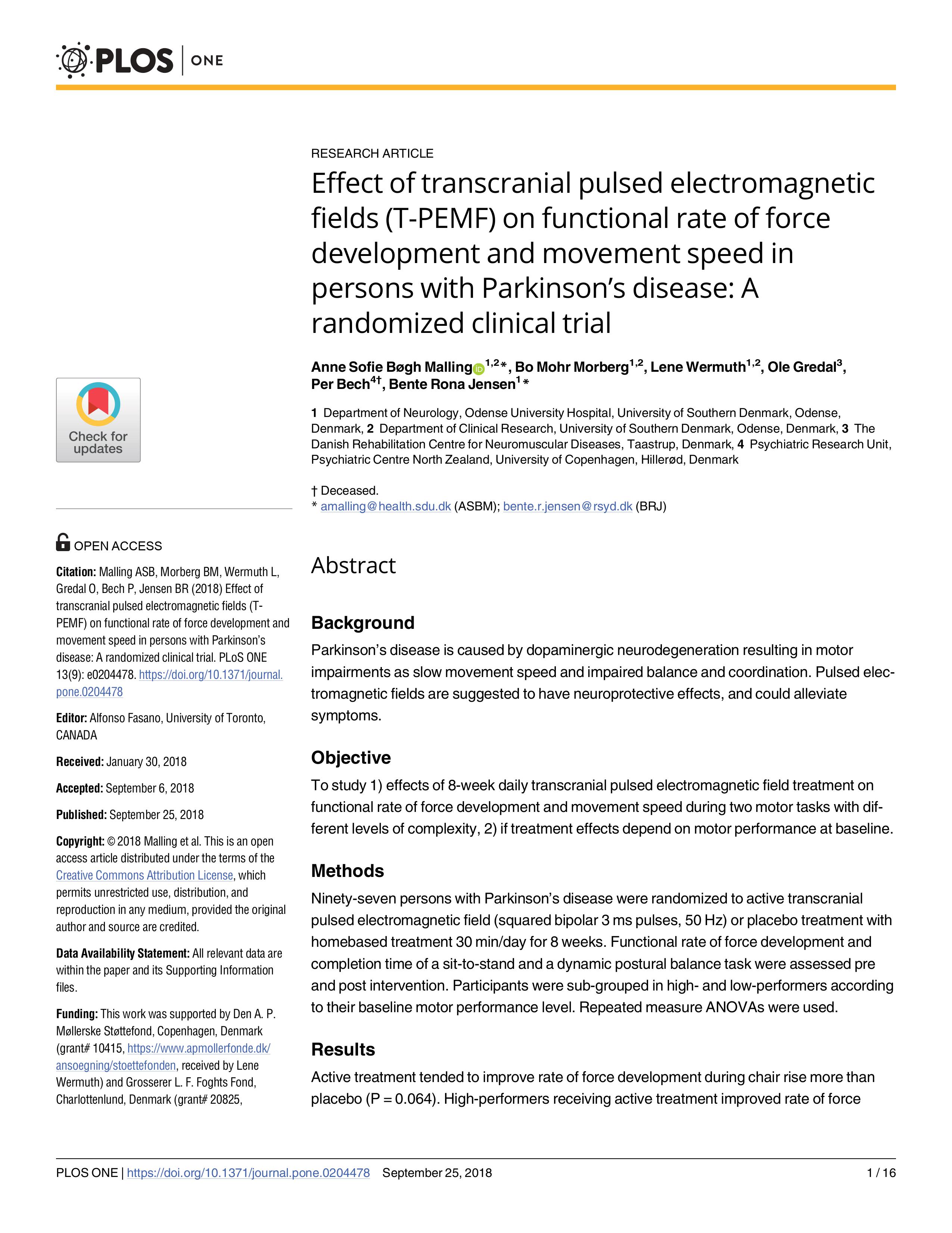 Effect of T-PEMF on functional rate of force development and movement speed in persons with Parkinson’s disease: A randomized clinical trial (2018)