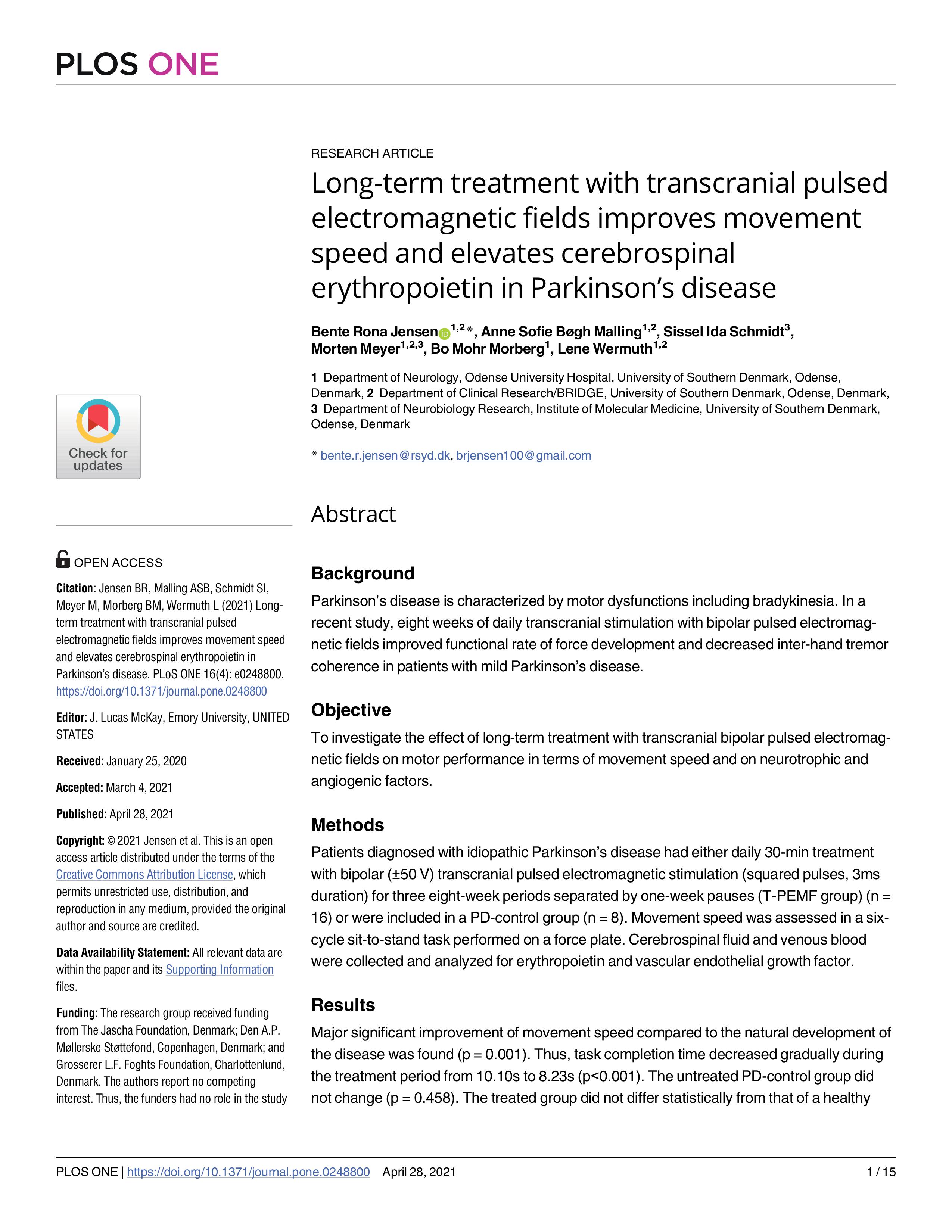 Long-term treatment with transcranial pulsed electromagnetic fields improves movement speed and elevates cerebrospinal erythropoietin in Parkinson’s disease (2021)